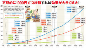 さらに、半年ごとに投資額を1000円アップすると、30年後の総投資額は1170万円、総資産額は1632万円になる。